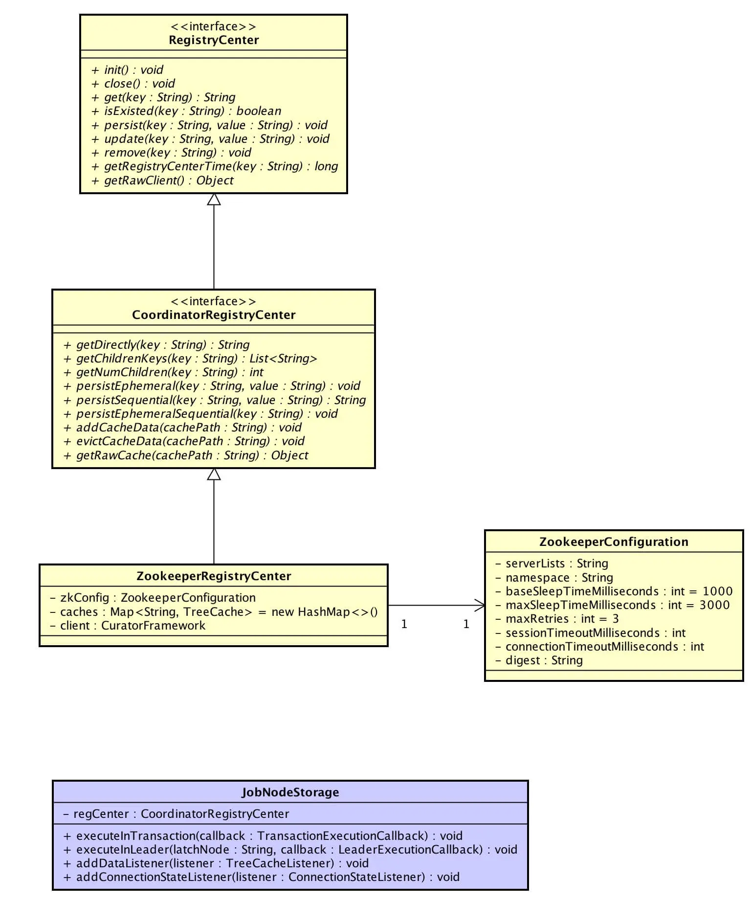 ZookeeperRegistryCenter,基于 Zookeeper 注册中心。从上面的类图可以看到,ZookeeperRegistryCenter 实现 CoordinatorRegistryCenter 接口,CoordinatorRegistryCenter 继承 RegistryCenter 接口。