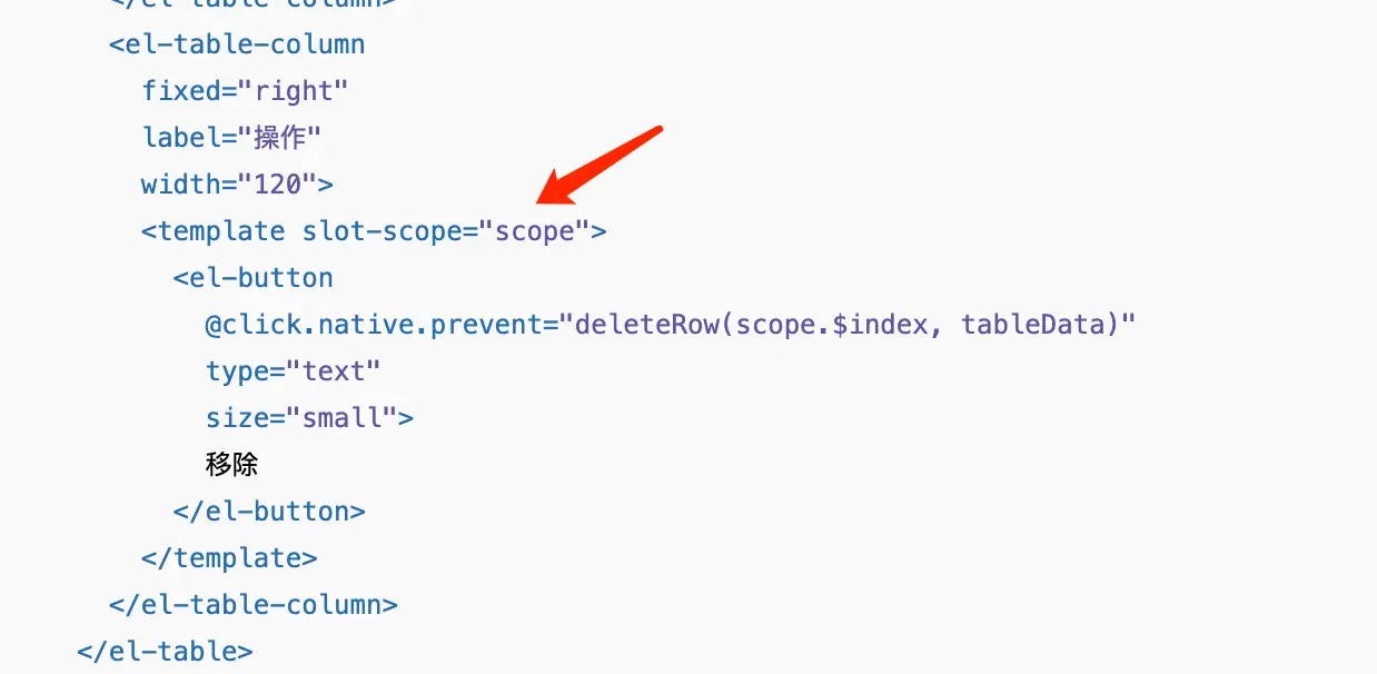 ElementUI大量使用了这种语法,比如在el-table中,使用了插槽的方式,获取到了子组件中的数据,存放在scope中