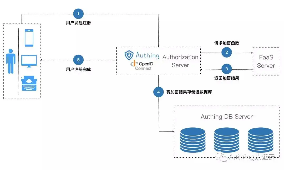 函数计算非常适合解决身份认证云中自定义密码加密的问题,以下是应用了函数计算后,用户注册的流程图: