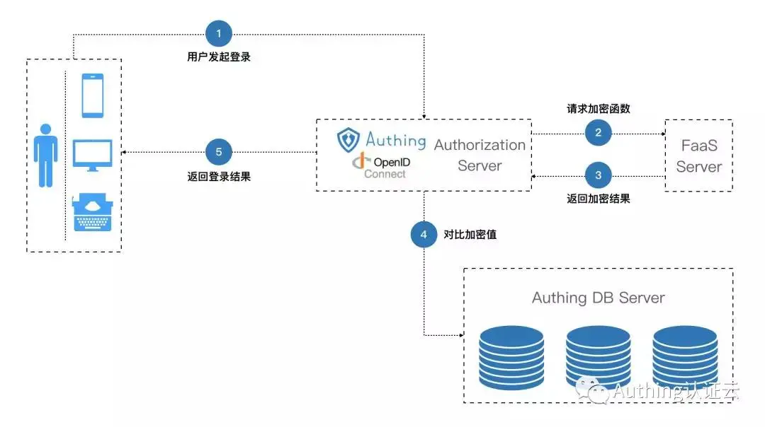 在一个用户系统中,用户的密码通常情况下都会加密存储在数据库中,这个加密算法一般是不可逆的,同时可以由一个函数完成,因此将函数计算应用在身份认证云中就能满足第一个要求。