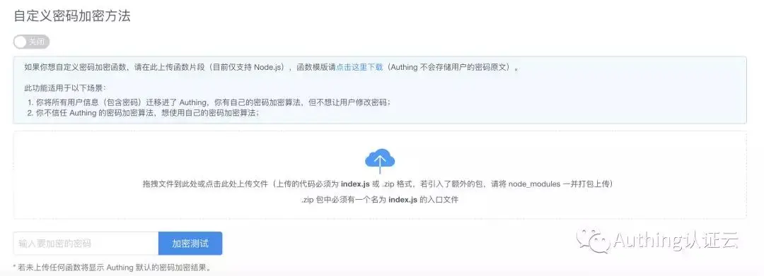 从开发者的角度来说,我们希望开发者只需要上传一个 index.js 文件就可以自定义密码的加密方式。如果开发者需要引入第三方包,那么仅需要将引入的 node_modules 打包为 .zip 上传即可。上传完成后,Authing 会取得一个可通过 HTTP 调用的网址,此网址不会公布给任何第三方,同时每个网址都会有独特的验证方式,最大限度的保证安全。