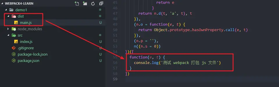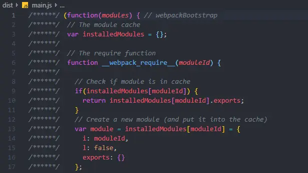 它将查找 ./src/index.js 作为默认入口点。 而且,它会在 ./dist/main.js 中输出模块包,目前代码量小,可以格式化看效果