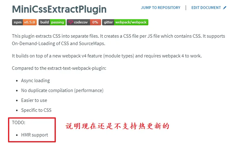 目前还不支持热更新,也就是在开发环境下更改了 css,需要手动的刷新页面才会看到效果,目前这个插件一般在生产环境中使用,开发环境下还是使用 'style-loader',具体见官网配置