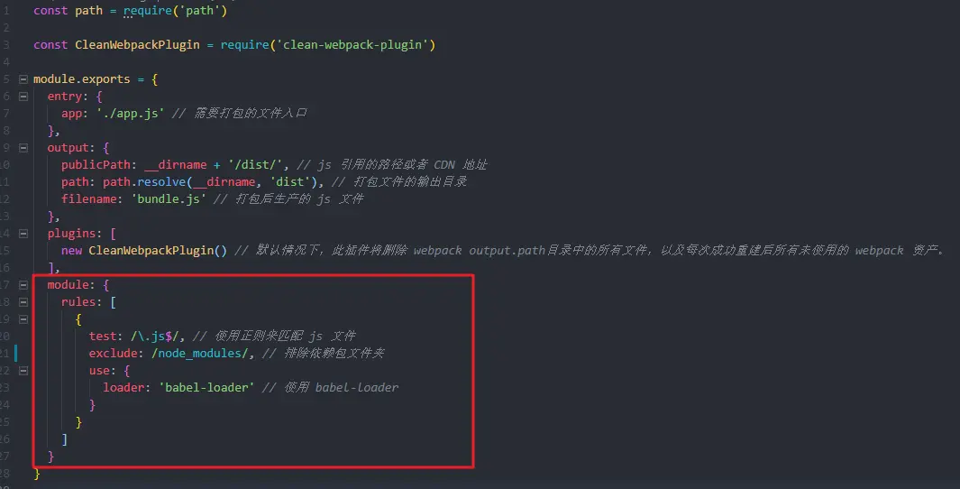 配置 module 中的 rules 属性,和配置 babel 一样,首先在 test 中使用正则来过滤 .css 文件,对 .css 文件使用 loader,'style-loader', 'css-loader'