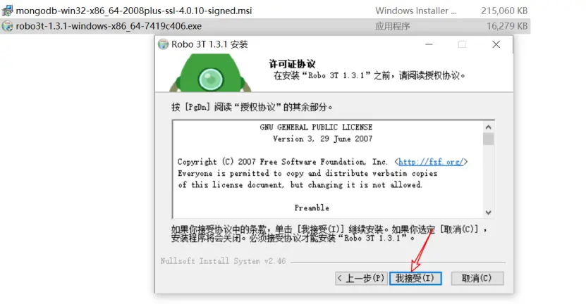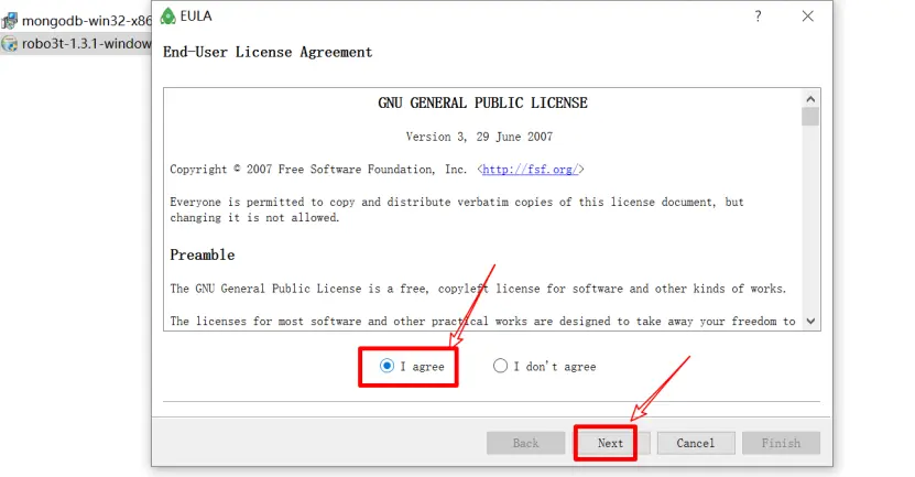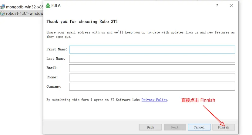 RoBo T3 可视化客户端安装 虎哥说IT 2019-08-18 390 阅读1分钟 RoBo T3 可视化客户端安装 1. 双击robo 3t安装文件,点击下一步 2. 接受服务条款 3. 指定安装目录即可,默认即可,点击下一步 4. 点击安装 5. 点击上一步的安装后,进入安装进度显示,等待成功安装即可 6. 点击完成,安装完毕 7. 当软甲安装完毕后,则默认会启动,效果如下,同意服务条款,点击下一步 8. 直接点击Finish 9. 成功安装后的界面