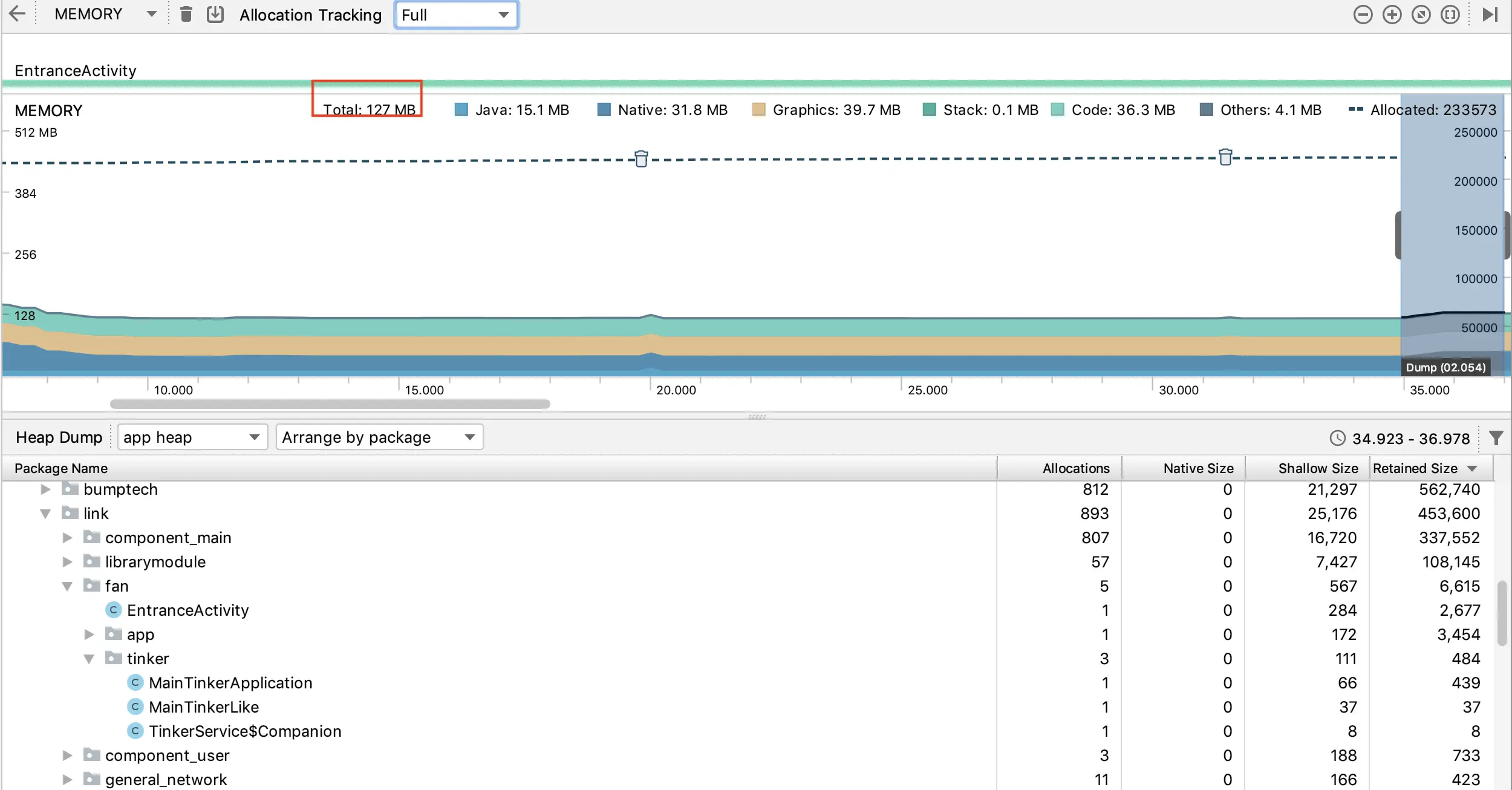 关闭service后再次使用Memory Profiler检查内存,可以看到,APP占用的总内存已经减少了