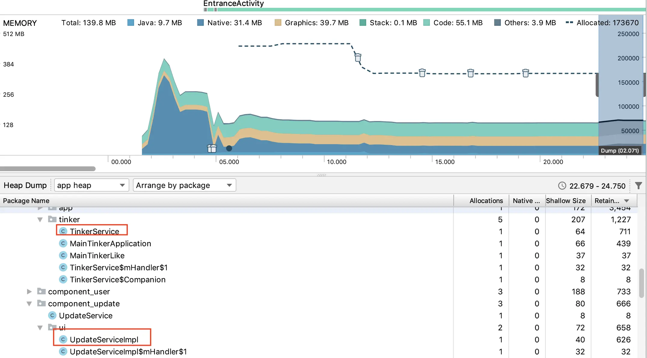 可以看到内存中依然存在TinkerService和UpdateService。没有特殊指定的service是运行在主线程中的,这些已经无用的Service会拖慢主线程并占据主进程的可用内存。