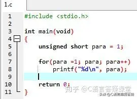 在我的PC机上,我使用sizeof求出了“unsigned short”类型变量是占用了两个字节,那么取值范围是“0-65535”。在这段C程序中,unsigned short类型变量para的初始值是1,只要它不是0,for循环就会一直执行。