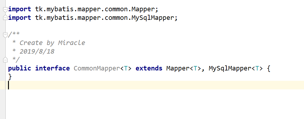 创建通用接口CommonMapper,这里必须继承Mapper已经MySqlMapper这两个接口,之后其他的所有mybatis接口只要继承此接口都会自动生成对应的CRUD方法。