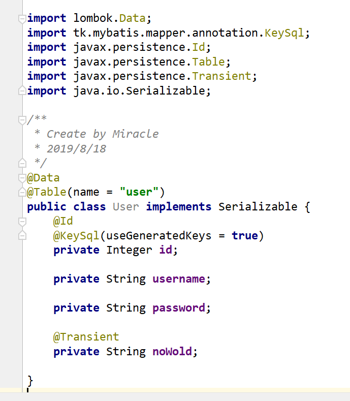 接下来创建User对应的pojo类,@Data 这个是lombok的注解,减少getter,setter,toString的编写,使你的实体类不会显得臃肿,@Table(name = "")这里填写对应的数据库表名,@KeySql(userGeneratedKeys = true)这个可以使得保存的数据返回生成的主键,实际开发中很实用。注意,下图有一个noWord属性,在之前给大家展示的表中,并没有此字段,为什么我会弄呢,因为实际开发中有可能,你这个实体类还带有其它对应表没有的数据,如果你不添加@Transient注解会报错,这个注解能够略去对应的属性字段(PS:我在这上面吃过不小的亏emmmmm)