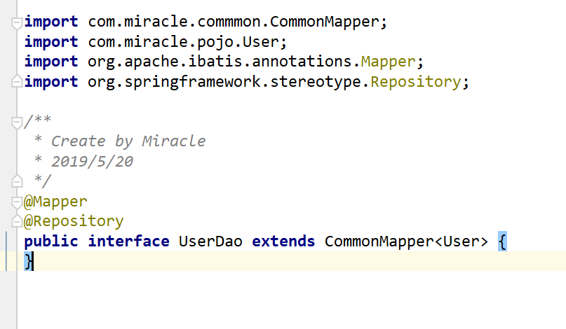 dao层代码,这里就需要继承之前的通用工具CommonMapper,其中的User对应的就是这个dao数据操作实体类。