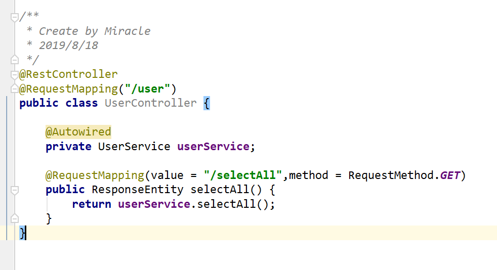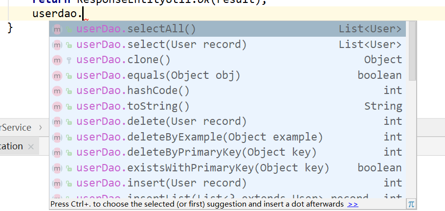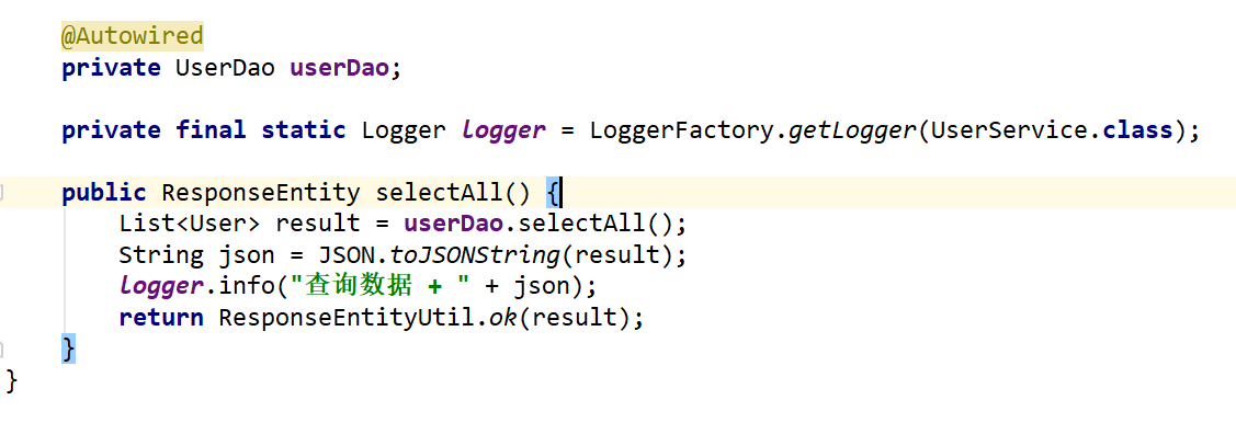 最重要的service层,如下图,我们看到userDao.selectAll()这个方法就是自动生成的