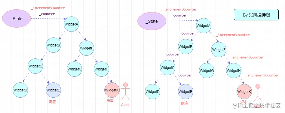 WidgetA又是由下面若干个自定义的Widget组成。那么问题来了,WidgetK点击时如何让WidgetE中的值+1?