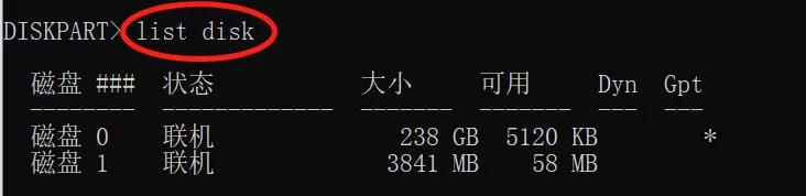 步骤1:输入list disk,列出所有磁盘。