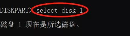 步骤2:根据容量判断,磁盘1是U盘(注意:千万别搞错了)。输入select disk 1,选择磁盘1。
