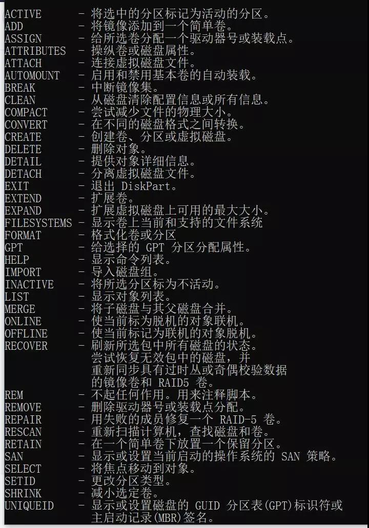 只是介绍一种解决问题的思路,diskpart工具许多功能,有兴趣的伙伴可在diakpart命令行中输入help,获取更多命令的使用说明,自行研究。