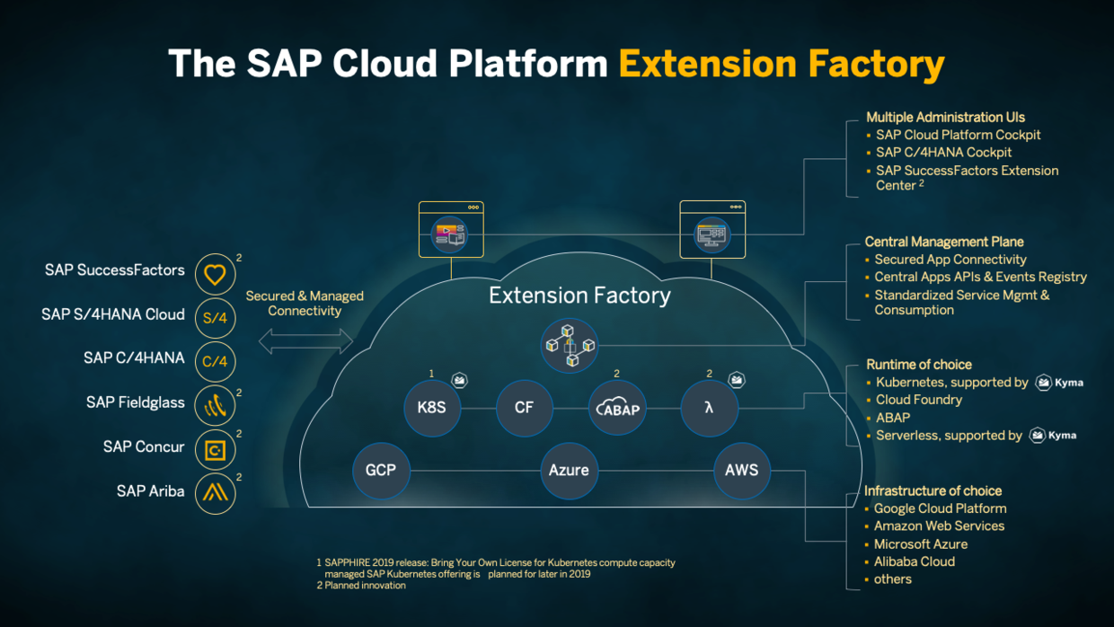 而SAP Cloud Platform Extension Factory,是SAP在开源项目Kyma上进一步完善而推出的一个商业化解决方案,本身并不单独卖,而是作为SAP云平台的一个组成部分。