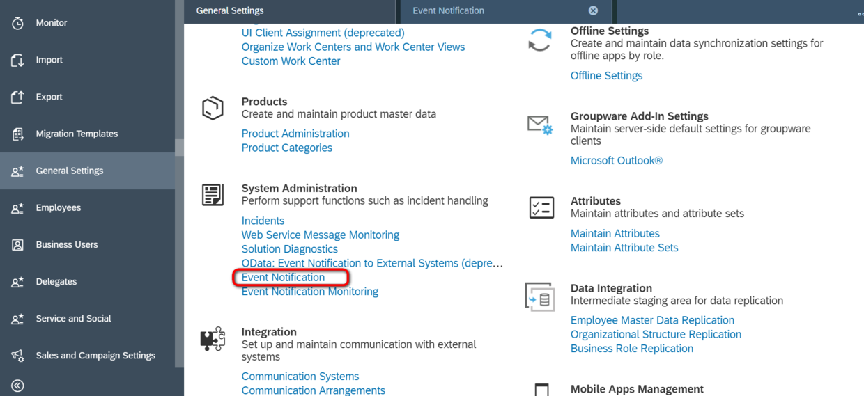 首先进入SAP Cloud for Customer的Administration的工作中心,打开General Settings视图,进入Event Notification配置UI: