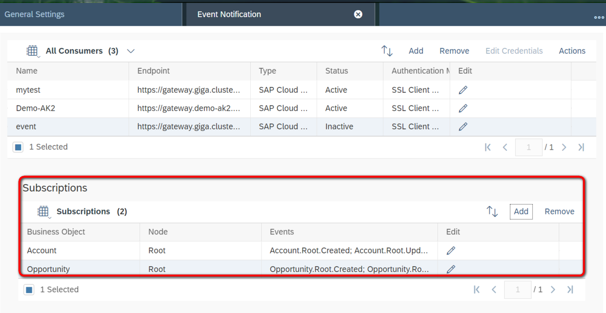 维护了回调用户名和密码之后,再添加Subscription,即您希望将Cloud for Customer系统里的哪些BO事件,发布给Kyma: