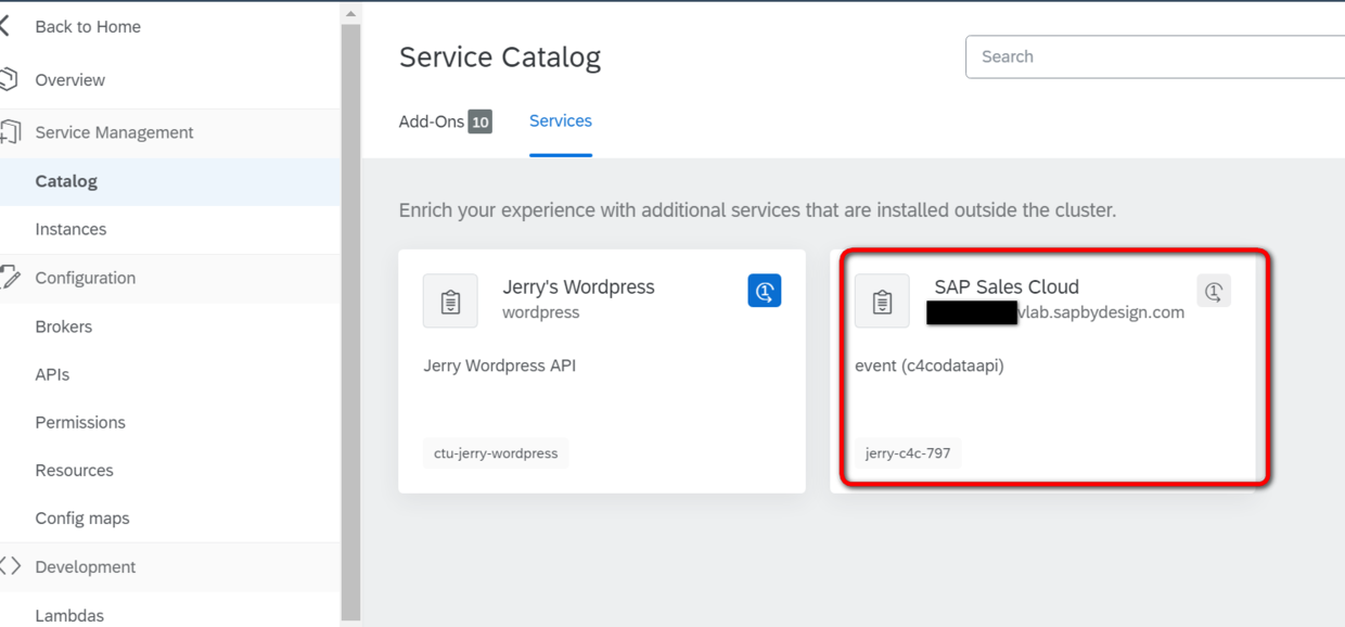 进入Kyma Service Management的Catalog界面下,找到从Cloud for Customer系统导入进来的服务,