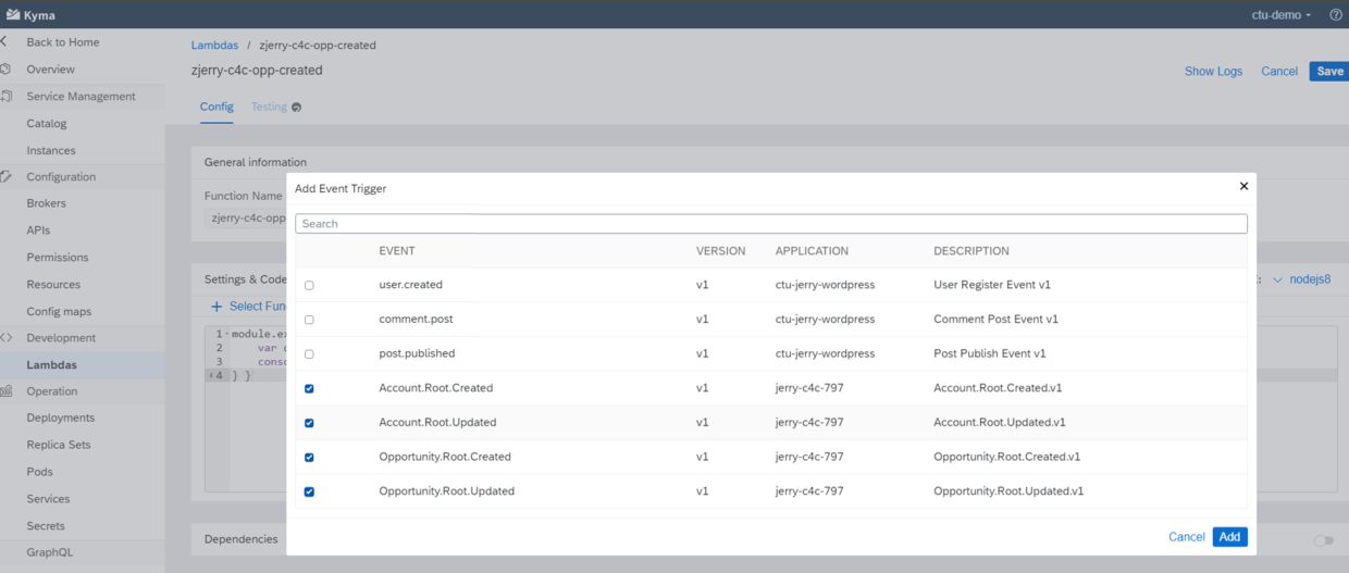 我选择了Account和Opportunity这两个BO的创建和更新事件,暴露给Kyma: