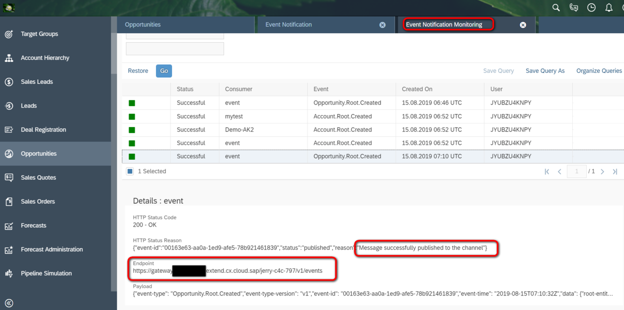 到C4C的Event Notification Monitoring界面去,观察到Opportunity创建的事件已经成功被投递到Kyma去了,对应的Kyma实例的url也可以在投递明细里查看到。