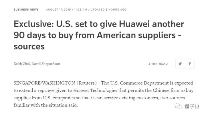 据路透社报道,两位熟悉情况的人士透露,美国商务部预计将把华为的“临时许可证”再次延长90天,这也意味着禁令再次推迟。相关各方没有对这一消息发表回应。