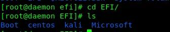 工作需要安装了多系统(先后安装了Windows、Kali、CentOS),采用UEFI来引导操作系统。UEFI全称为:Unified Extensible Firmware Interface(统一的可扩展固件接口),近些年新出的计算机都支持UEFI方式。 原默认是CentOS的为首选启动项的。某天升级了Kali内核,Kali修改成为首选启动项。工作主要是用CentOS,每次启动需要人工去选系统比较麻烦。了解到efibootmgr可以改动首选项,以下介绍了这个工具用法。 进入CentOS,命令行环境下,root账户操作,可以定位到/boot/efi/目录(看到如下图示),有BOOT,EFI二个目录。