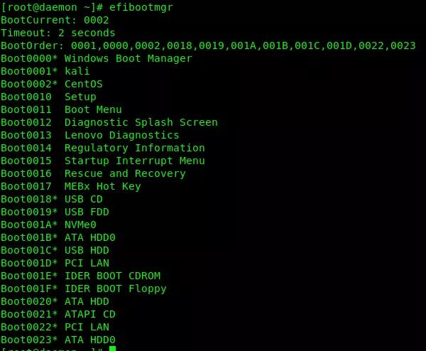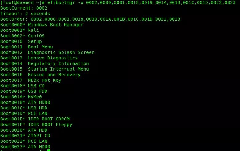 启动顺序进行Kali、CentOS互换,输入efibootmgr -o 0002,0000,0001,0018,0019,001A,001B,001C,001D,0022,0023 (如下图所示),执行后看到启动顺序已经更换。