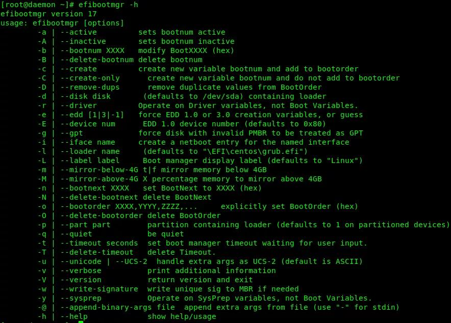 efibootmgr工具还有许多功能(比如隐藏启动项、修改启动项、删除无用的启动项、超时时间等),这里不一一介绍,有兴趣的朋友可以通过efibootmgr -h查看各参数用法说明(如下图所示),自行摸索。