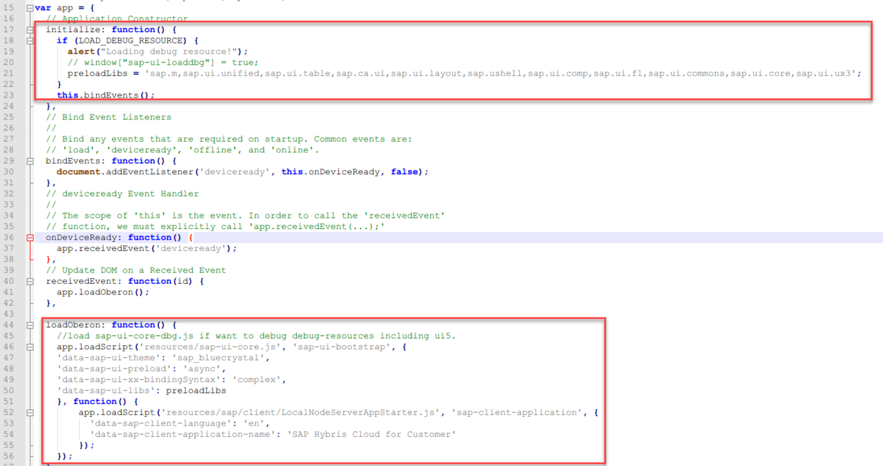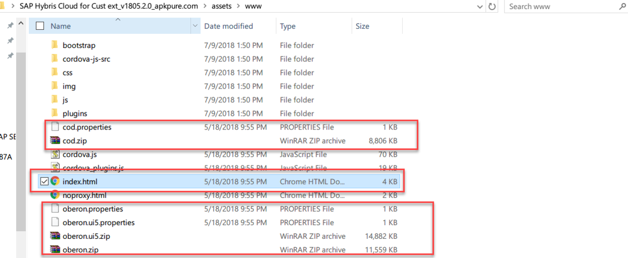 Jerry在博客(blogs.sap.com/2017/08/17/… 风格app, 文中有讲到我们在开发这样一个app的时候会有一个默认的index.js生成,我们基于这个文件为入口进行开发cordova的应用,我们在assets->www下面找到了这个index.js文件,同时我们看到了几个zip包,这几个zip分别来自我们C4C开发组所开发的oberon和lead cod,里面包含了我们开发的javascript代码和样式表文件,这些文件即是上文提到的保存在cordova构建出来的项目包里的代码和html文件。