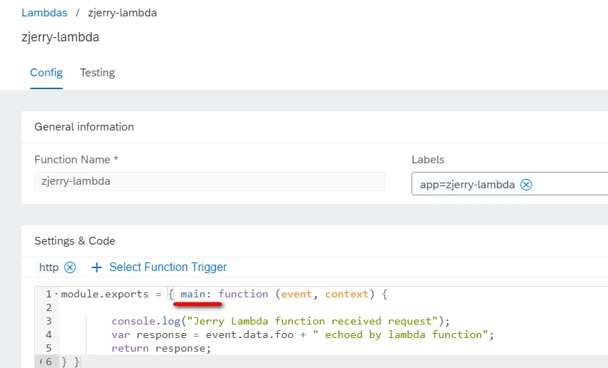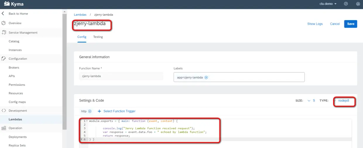 比如在最近Jerry写的一系列SAP Kyma的文章里介绍过,我在Kyma上创建了一个名为zjerry-lambda的函数,基于nodejs8: