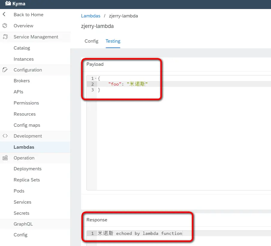 可以直接在Kyma的测试控制台里调用这个Lambda Function: