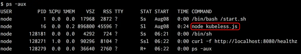 进入之后,查看进程列表,发现了node kubeless这个进程,Jerry顿时觉得有点眉目了: