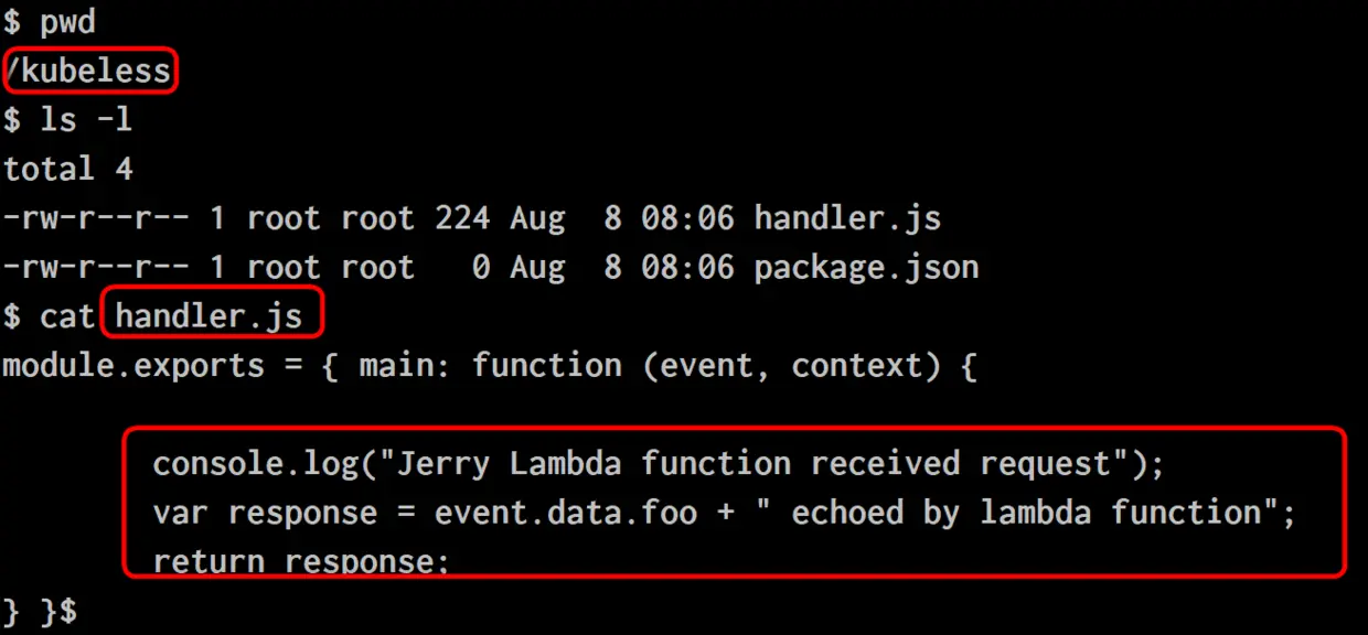 在Lambda Function的Serverless框架,即kubeless.js运行时,会从pod内部的kubeless这个文件夹里,找到应用开发人员编写的Lambda Function,加载并运行。