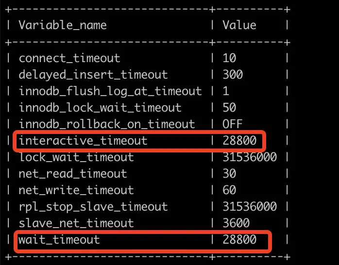 但是当时使用'show variables like "%timeout%"'它明明是28800,原因上面文章中已经给出了。