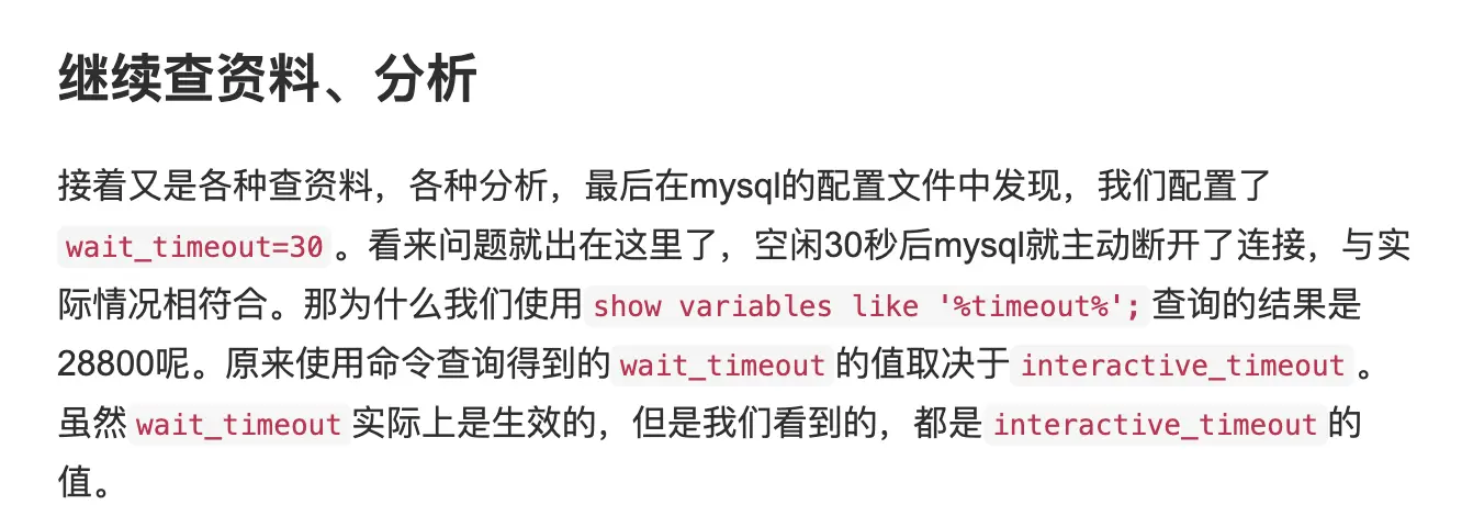于是顺着这个信息,在网上找了一番,大部分给出的都是和wait_timeout以及interactive_timeout有关。