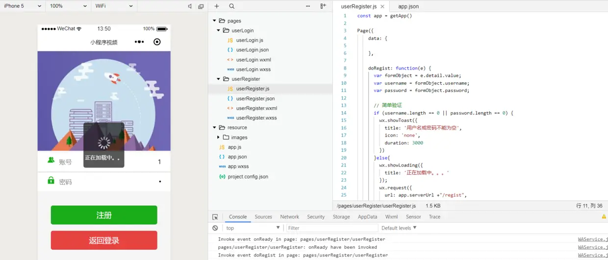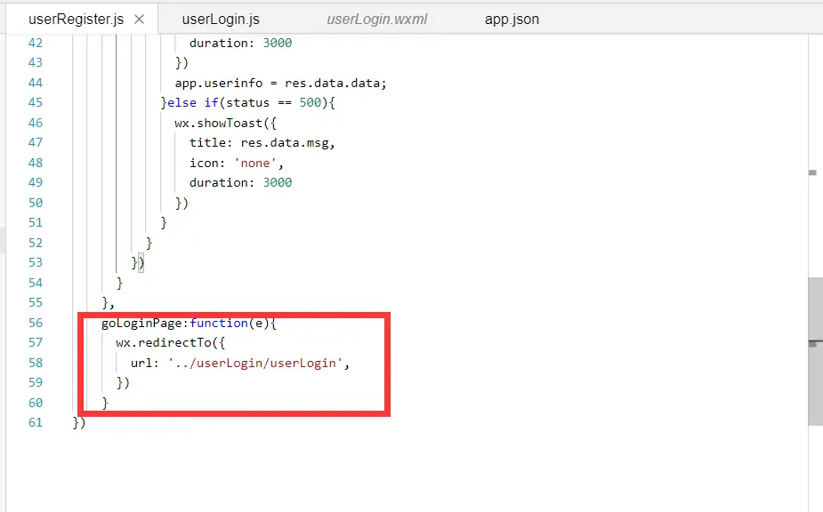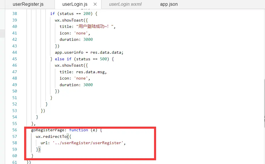 userRegister.jsconst app = getApp() Page({ data: { }, doRegist: function(e) { var formObject = e.detail.value; var username = formObject.username; var password = formObject.password; // 简单验证 if (username.length == 0 || password.length == 0) { wx.showToast({ title: '用户名或密码不能为空', icon: 'none', duration: 3000 }) }else{ wx.showLoading({ title: '正在加载中。。。' }); wx.request({ url: app.serverUrl +"/regist", method:"POST", data: { username: username, password: password }, header: { 'content-type': 'application/json' // 默认值 }, success: function (res) { console.log(res.data); var status = res.data.status; wx.hideLoading(); if(status == 200){ wx.showToast({ title: "用户注册成功~!", icon: 'none', duration: 3000 }) app.userinfo = res.data.data; }else if(status == 500){ wx.showToast({ title: res.data.msg, icon: 'none', duration: 3000 }) } } }) } }, goLoginPage:function(e){ wx.redirectTo({ url: '../userLogin/userLogin', }) } })