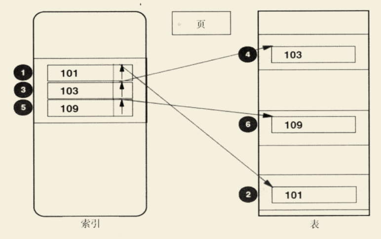 图的左边是索引的一个窄片段,我们称这个片段为索引片。这个片段会被顺序扫描,上面索引行的值在100到110之间,相应的表行将通过同步读从表(也可能在缓冲池)中读取。