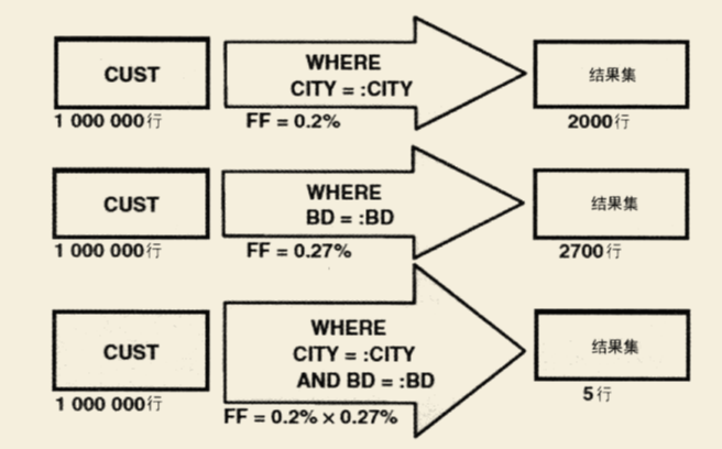 比如组合谓词 CITY = :CITY AND BD = :BD的过滤因子等于谓词 CITY = :CITY 和谓词 BD = :BD 的过滤因子的乘积。