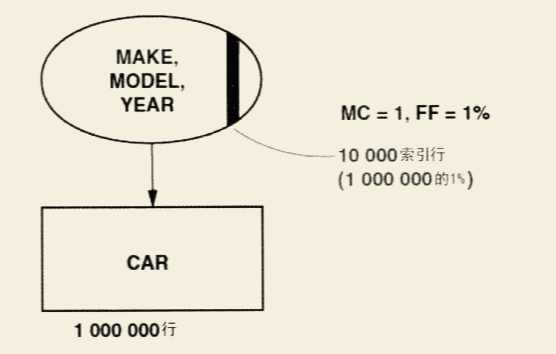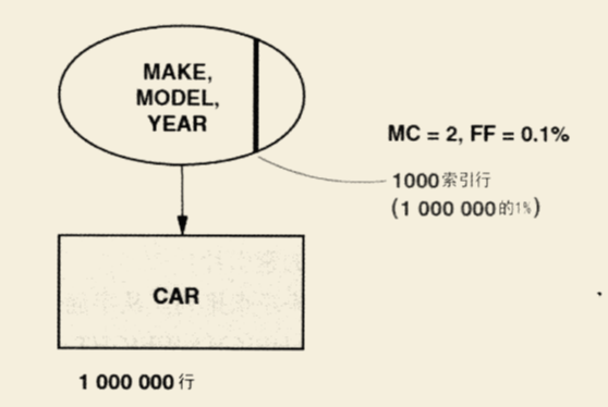 MAKE 和 MODEL都是匹配列。如果组合谓词的过滤因子是0.1%,那么所需要访问的索引片大小将为整个索引的0.1%。