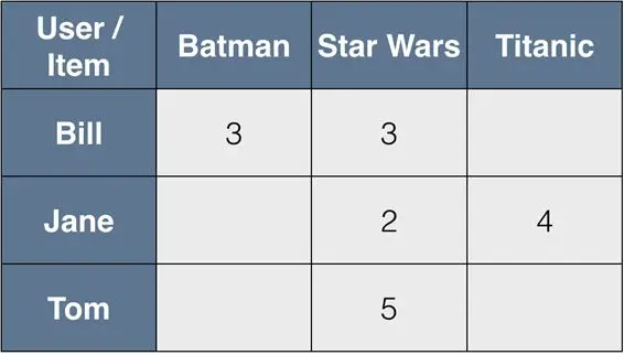 其次,假设要比较Bill和Jane这两位用户,从图中可以看到,用户Bill没有看过《泰坦尼克号》,用户Jane也没看过《蝙蝠侠》,所以我们只能通过《星球大战》来测量二者之间的相似性。至于相似性,一般会采用余弦相似性或用户/项目矢量之间的相关性来测量。