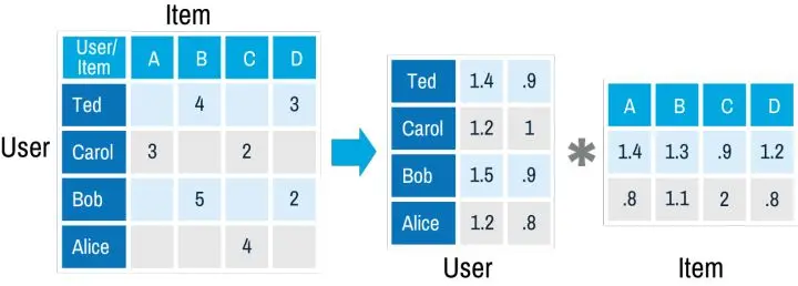 另一种方法是使用矩阵分解,这种推荐算法相对更“优雅”。一般来说,当涉及到矩阵分解时,不会过多考虑哪些项目将保留在结果矩阵的列和行中。使用这种推荐算法,我们可以看到,u是第i个用户的兴趣向量,v是第j部电影的参数向量。