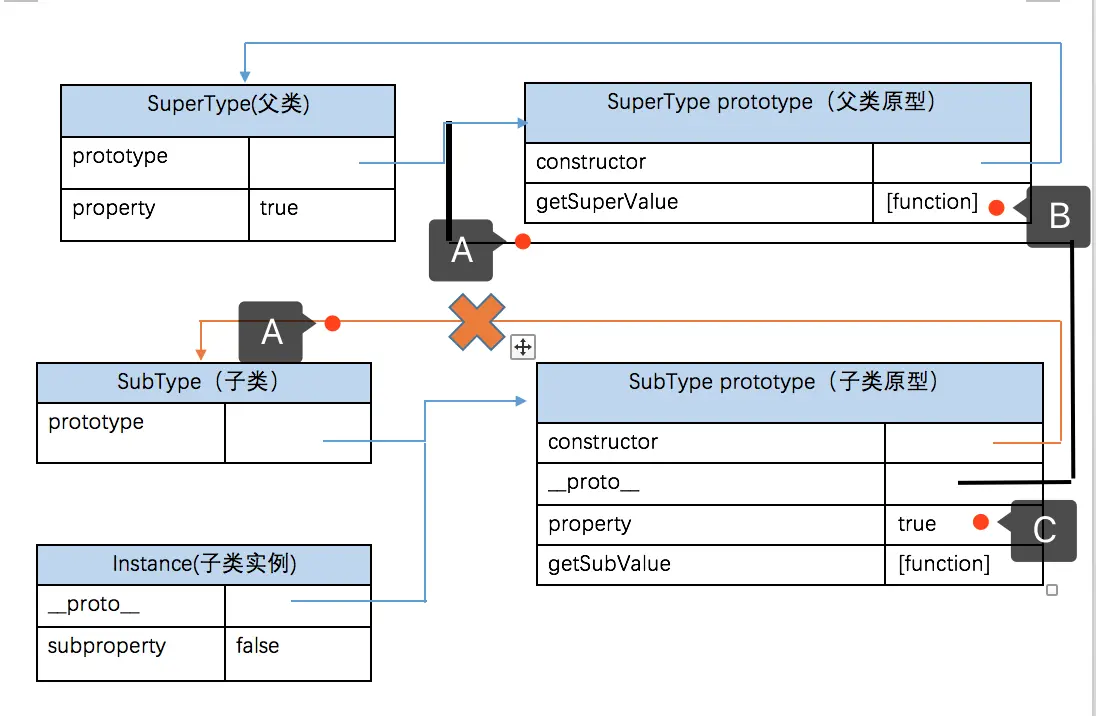 基本思路:使用原型链实现了对原型属性和方法的继承(B处),通过借用构造函数实现对属性的继承(A处)。这样既通过在原型上定义方法实现了函数复用,又能保证每个实例都有自己的属性