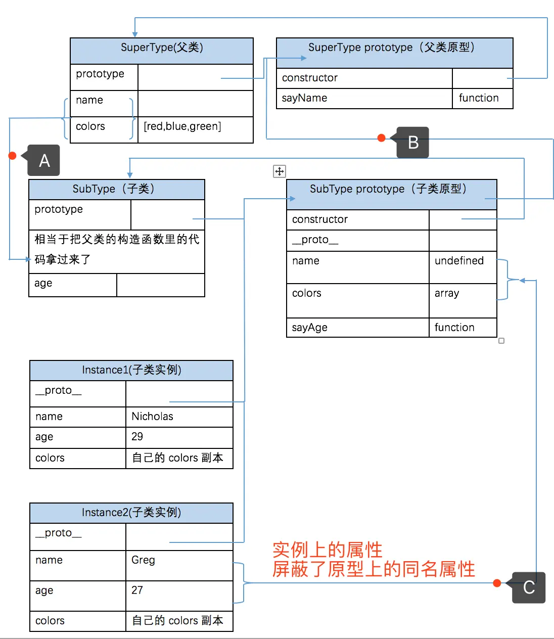 SubType.prototype.constructor = SubType;//因为重写了SubType.prototype嘛,所以我们要把新的原型对象的constructor再重新赋值回来