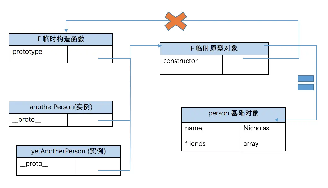 基本思想:不是严格意义上的构造函数。新的实例以person基础对象作为原型,person的属性就会被实例所共享。实际上,相当于创建了person的两个副本。实质上可以理解为复制