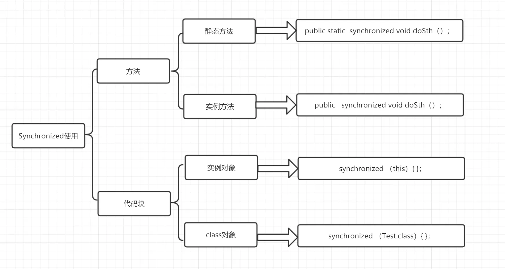 synchronized关键字可以作用于方法或者代码块,最主要有以下几种使用方式,如图: