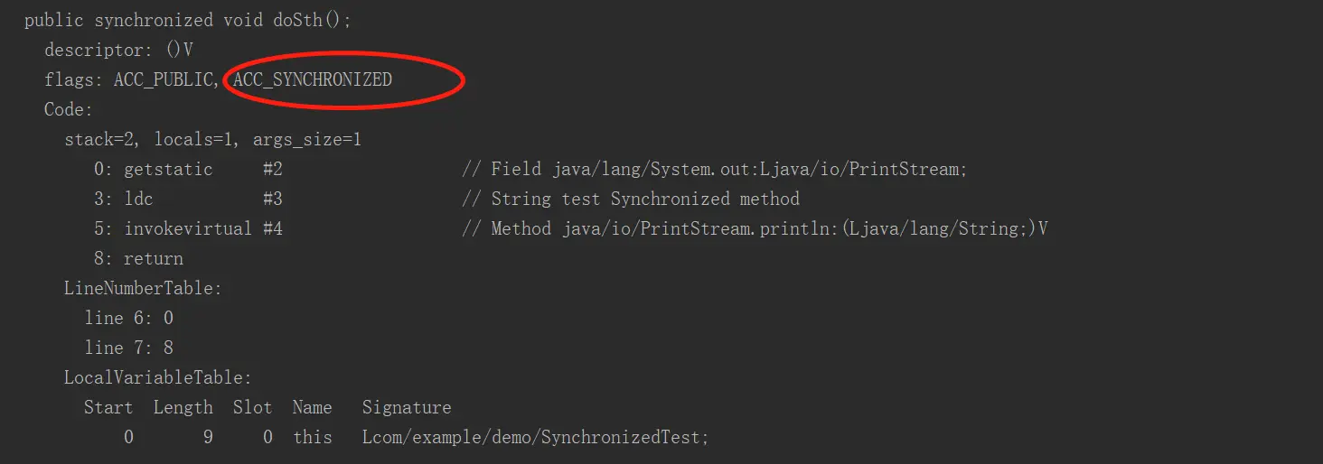 由图可得,添加了synchronized关键字的方法,多了ACC_SYNCHRONIZED标记。即JVM通过在方法访问标识符(flags)中加入ACC_SYNCHRONIZED来实现同步功能。