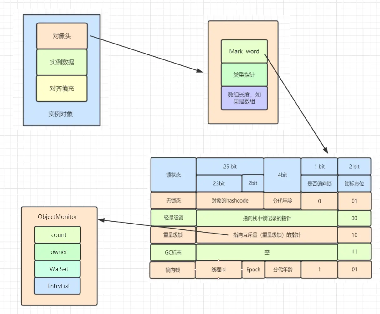 - 其实synchronized是重量级锁,也就是说Synchronized的对象锁,Mark Word锁标识位为10,其中指针指向的是Monitor对象的起始地址。