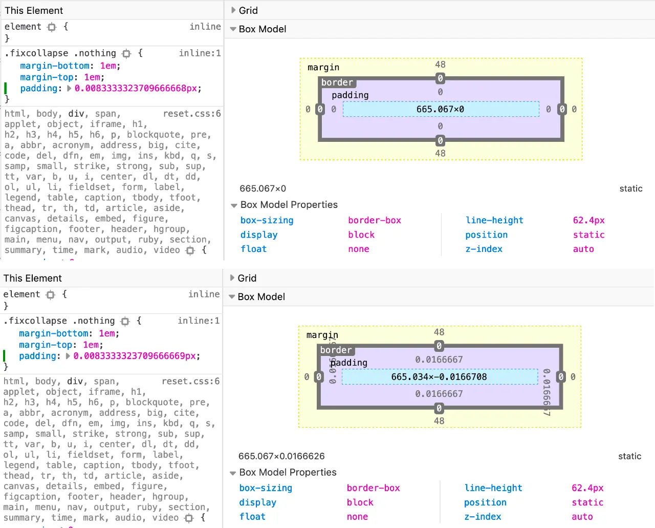 就最近,@hj_chen在墨尔本首届Talk.CSS大会上就聊到亚像素和border相关的话题。首先和大家聊了不同浏览器中盒模型中padding最小值会有何不同,直接上文章中的图吧: